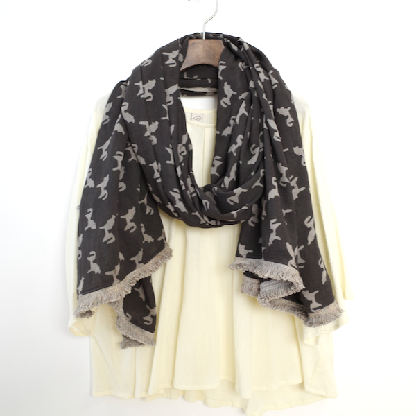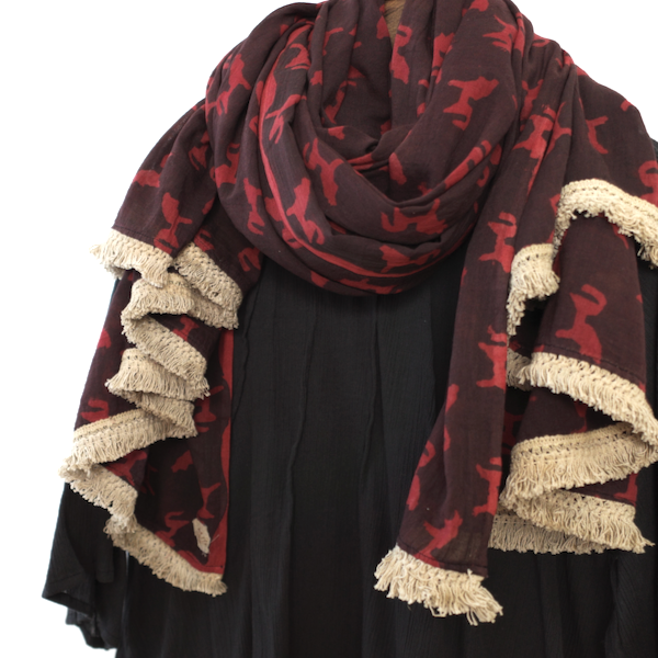 ふんわりコットンボイルをたっぷり使った大判ストール。無骨な黒地にフリンジレースの甘さが効いています。キュッとぐるぐる巻いても可愛いです。