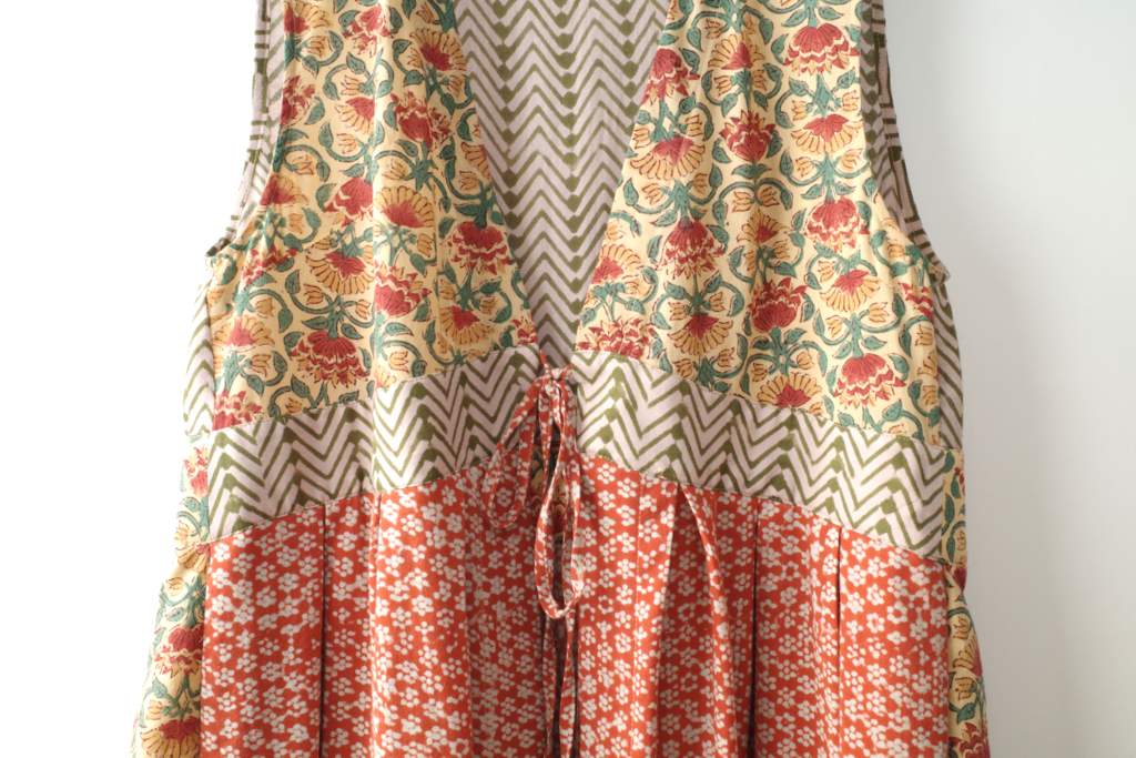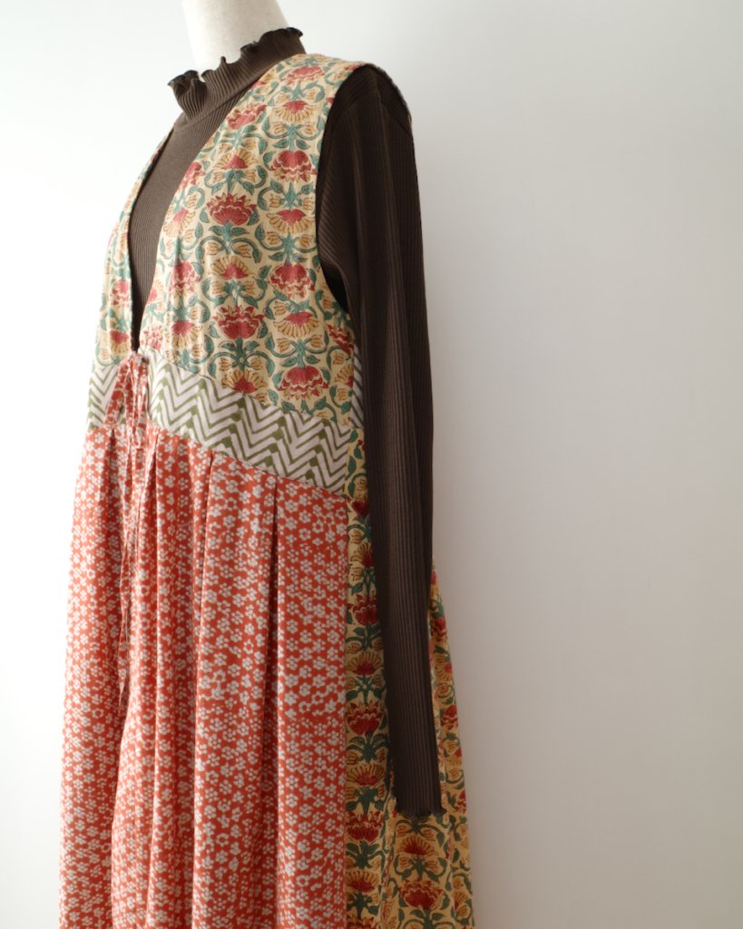 すでにヘビロテのこちらの本から、今回はV開きの袖付きワンピースをジレ風にアレンジして製作しました。