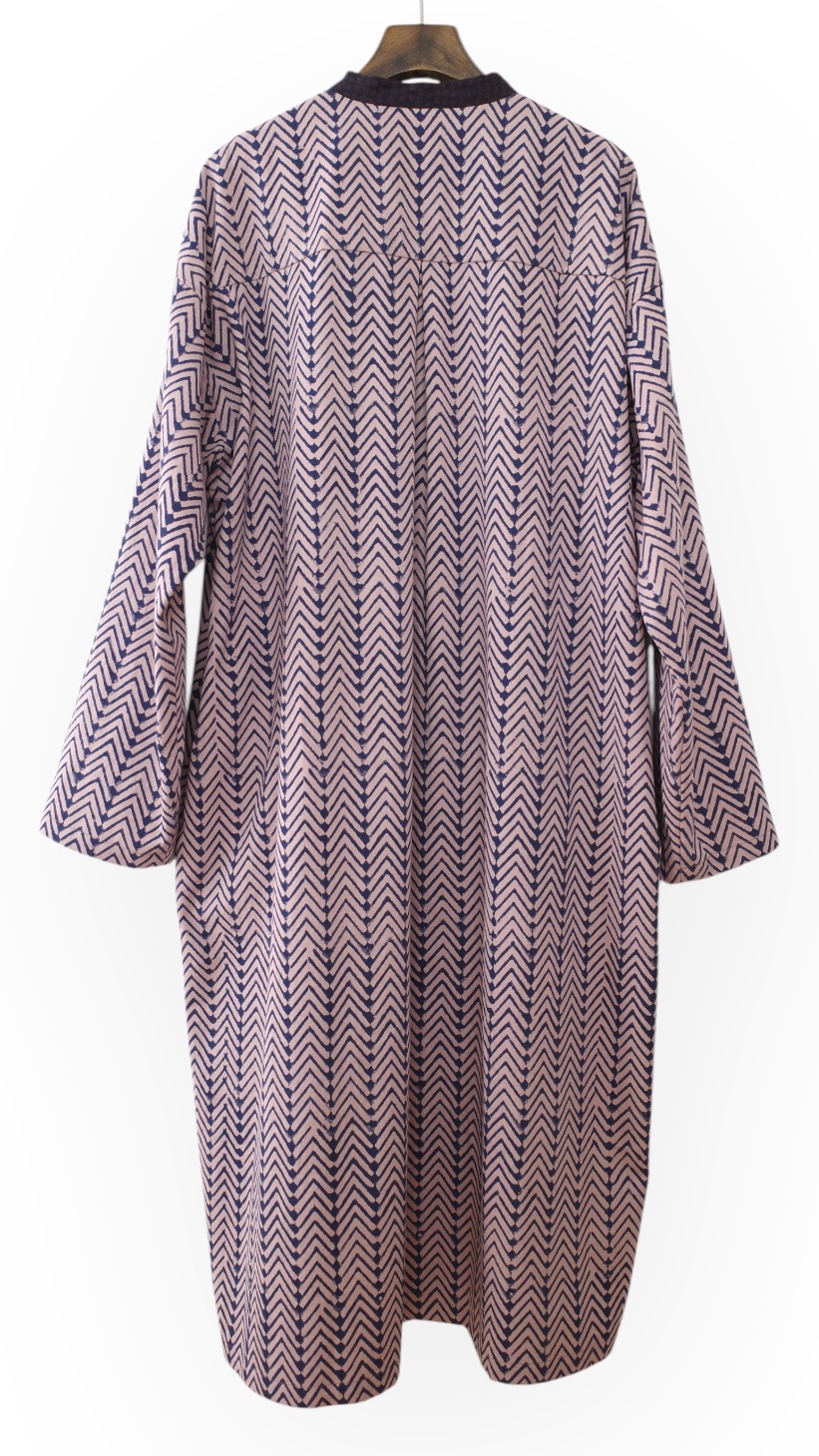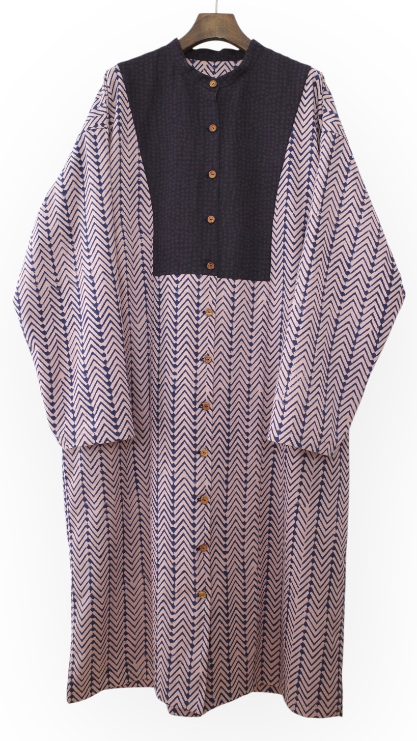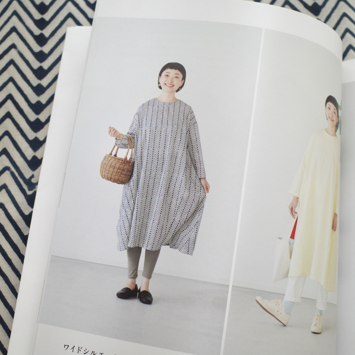 ジグザグ柄「arrow」のキャンブリック薄地です。この柄は生地の状態だと少し控えめなのですが、洋服に仕立てると輝きます。美濃羽さんの着こなしも素敵ですね~!