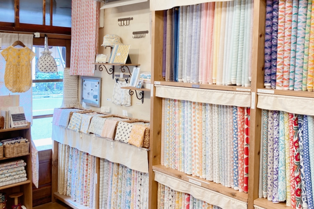 1メートルから10cm単位で生地のカット販売をしております。そのほか、クラフト感あふれるボタン・パーツ・レースなどの付属パーツ類、ハンカチ・洋服などの既製品も少し扱っております。